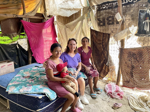Miriam (age 14) with her baby and mother inside their makeshift hut in Mirador. Arlene and the family frequently visit door to door in the villages to share the gospel and pray for families.